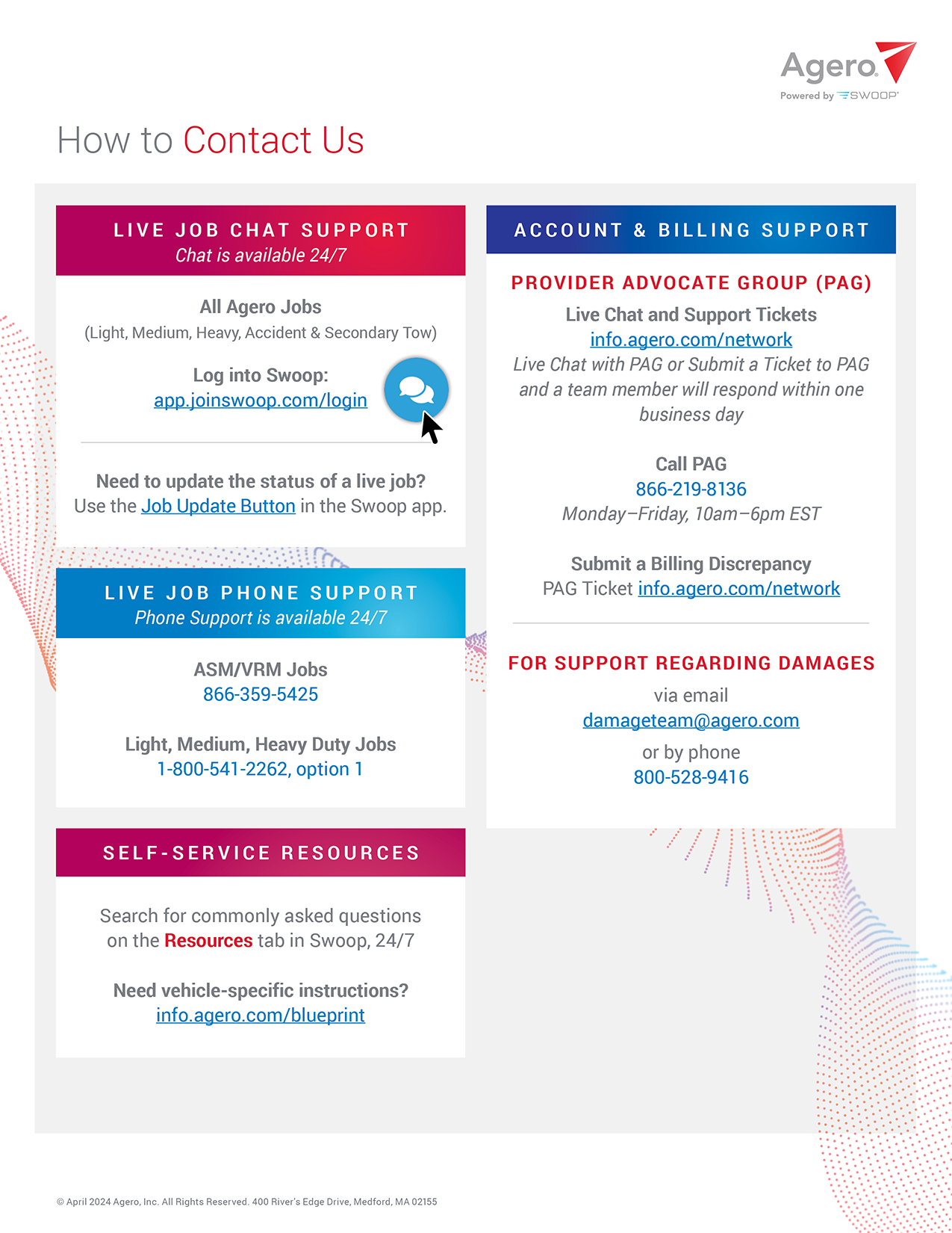 - Live Chat and Support Tickets: Visit info.agero.com/network; tickets will be responded to within one business day